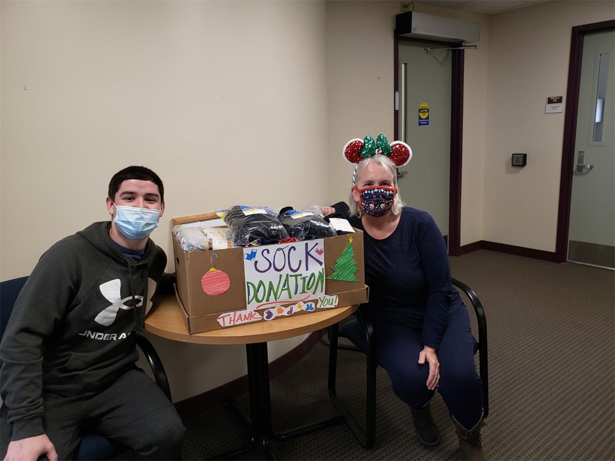 Our December service project was a sock drive for Milestones Recovery in Portland ME. We had a little competition between UNE, USM, St. Josephs and Maine Medical Center to see who could collect the most socks and between all of them we were able to collect over 1000 pairs of socks and St. Josephs College led the way collecting the most socks! Pictured is SJCME student, Noah Carpenter, and faculty member Martha DeCesere with the socks!