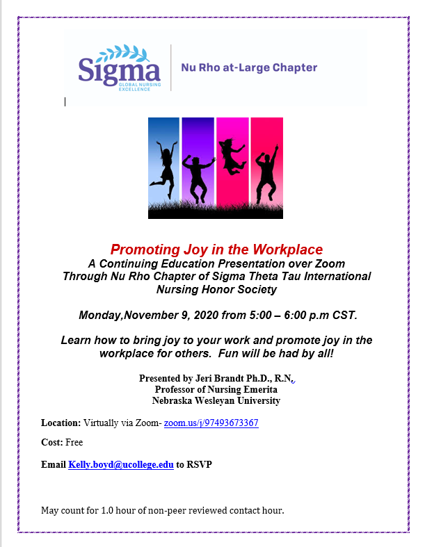 Please join us, at the comfort of your own home, for an educational event "Promoting Joy in the Workplace" presented by Dr. Jeri Brandt, Professor of Nursing Emerita from Nebraska Wesleyan University